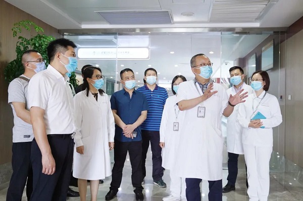 ▲在重庆市人民医院,梁启云局长带领考察团先后参观了医院门诊、检验检查、肝胆胰腺外科病房和乳腺甲状腺外科病房等区域,了解医院院自2020年4月29日全面开诊以来院本部建设发展情况。