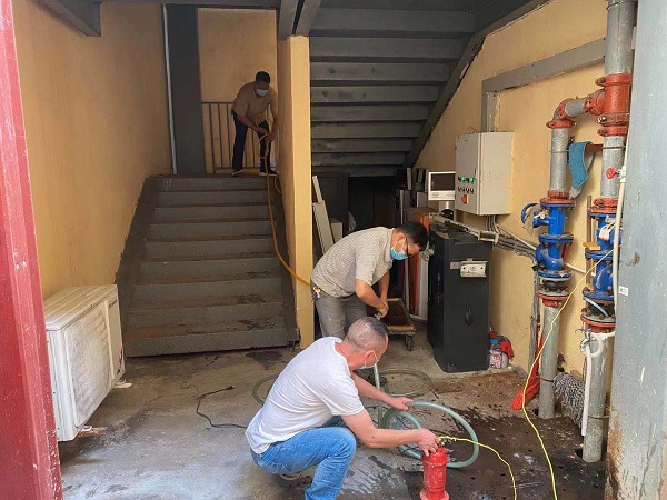 图:抢险救援队对地下室进行排水