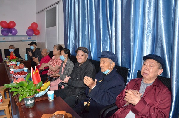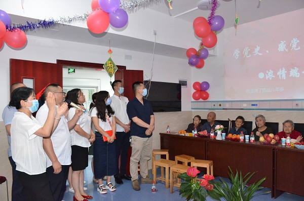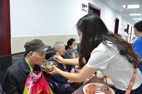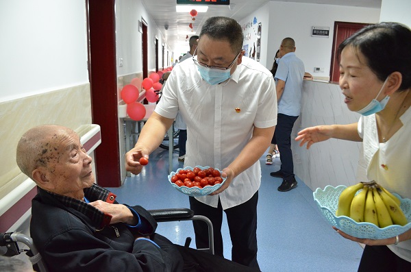何兴林带领党员干部对老人们进行亲切慰问,给他们送上水果、点心、粽子,党员为行动不便的老人进行擦手、喂饭等志愿服务,用实际行动践行党史学习教育的深刻涵义。