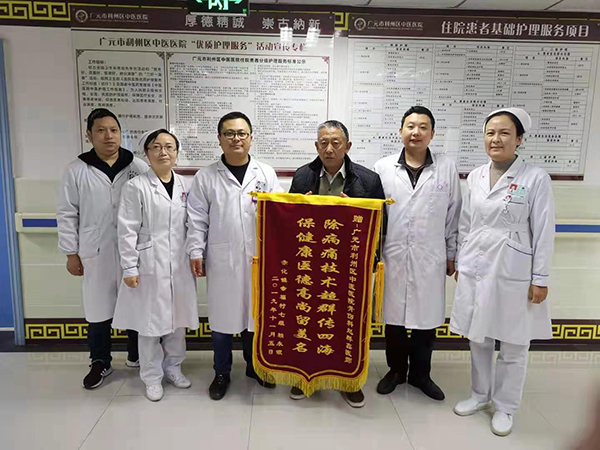 医术高明除病痛,医德高尚暖人心。11月8日上午,宝轮镇幸福村的赖爷爷来到利州区中医医院,亲手将“除病痛技术超群传四海,保健康医德高尚留羡名”的大红锦旗送到他的主治医师赵群鑫手中。