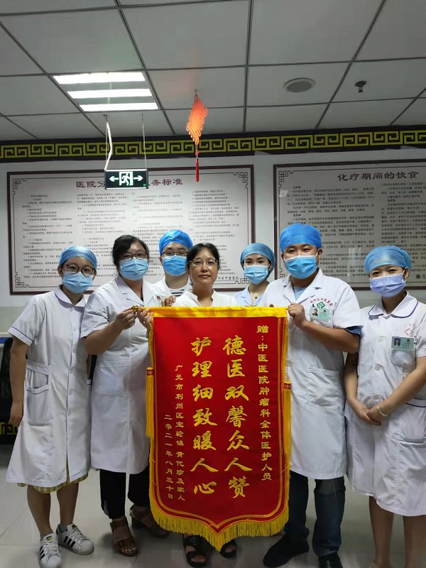 近日,患者黄某的家属将一面写有“德医双馨众人赞,护理细致暖人心”的锦旗送到利州区中医医院肿瘤科医生办公室,感谢肿瘤科全体医护人员住院期间贴心细致的医疗护理服务。
