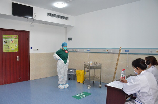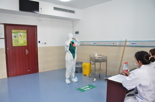 比赛现场,护理人员在紧张的理论知识答题后逐一前往实操技能场地进行准备。通过展示徒手心肺复苏术和穿脱防护服两项技能,以求全面考核参赛选手急诊抢救能力和穿脱防护服的规范性。