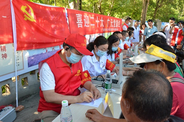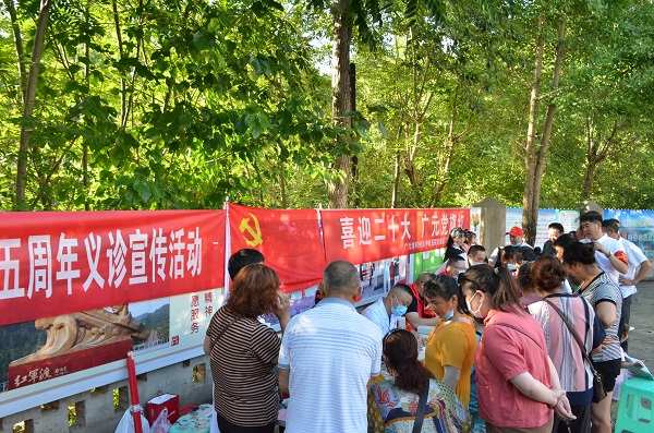 6月29日,利州区中医医院组织全体党员干部深入宝轮镇红星村开展“喜迎二十大·广元党旗红”志愿服务暨《中华人民共和国中医药法》实施五周年义诊宣传活动。