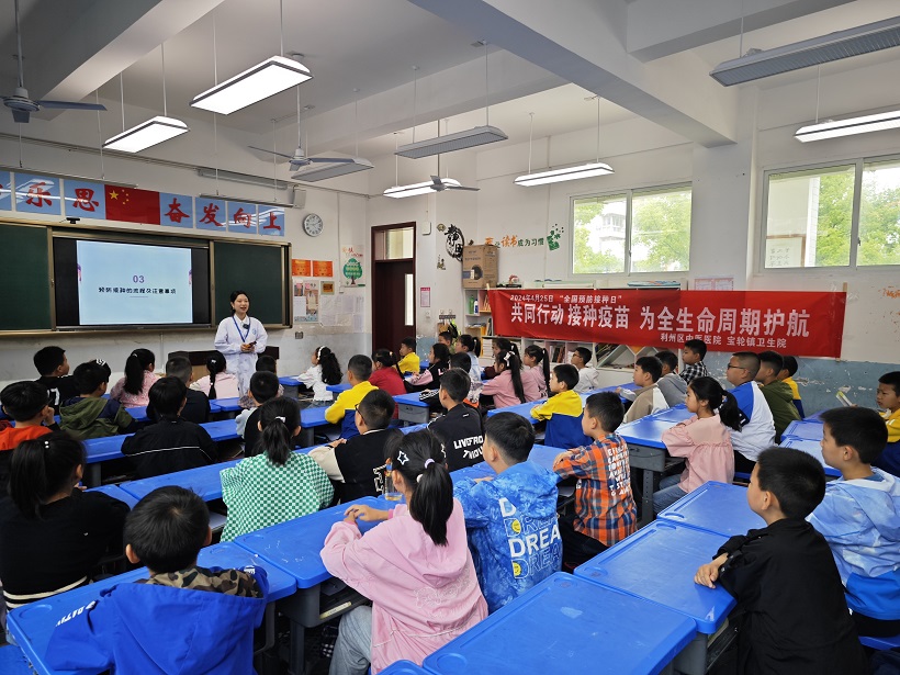 2024年4月25日,是我国第38个“全国儿童预防接种日”。为进一步宣传预防接种对降低传染病发病率、保护人民健康的重要意义,4月24日上午,宝轮镇卫生院以“共同行动 接种疫苗 为全生命周期护航”为主题,组织医务人员前往利州区七一宝轮小学开展健康知识讲座。